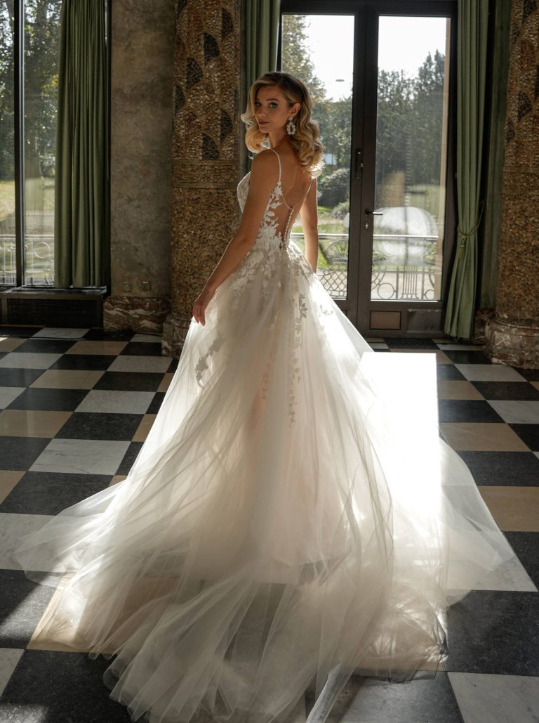 Un abito da sposa impalpabile in tulle glitter con ramage ricamato. I ricami avorio risaltano su una base nude delicatissima, creando un gioco di trasparenze lieve ed etereo.