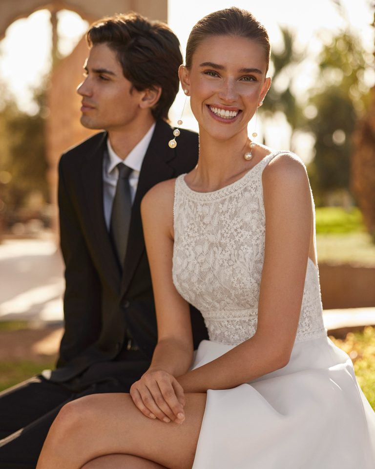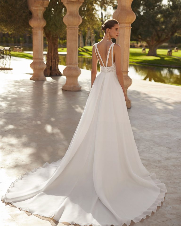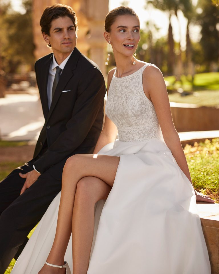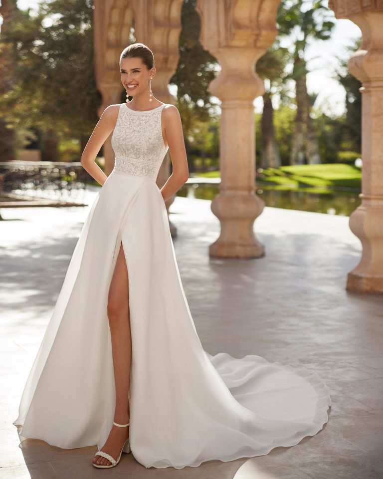 L’abito da sposa Ombra di Rosa Clará è l’emblema della raffinatezza moderna. Il corpetto in pizzo ricamato con scollo omerale alto si fonde con la gonna fluida, arricchita da uno spacco sensuale.