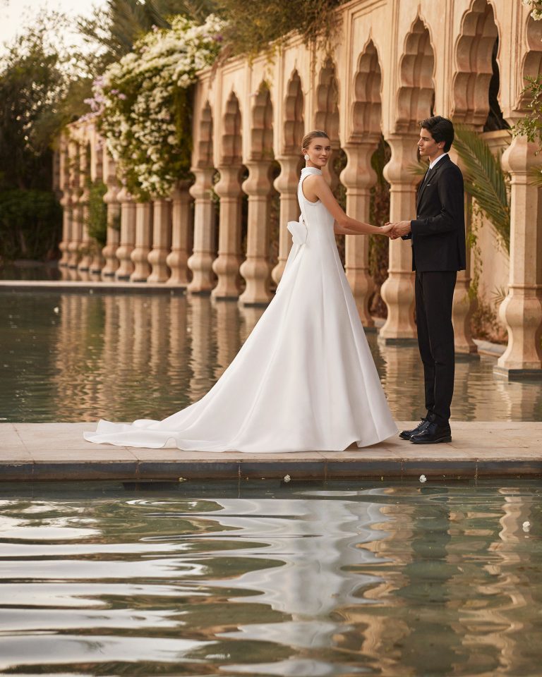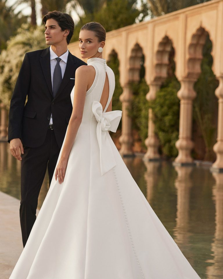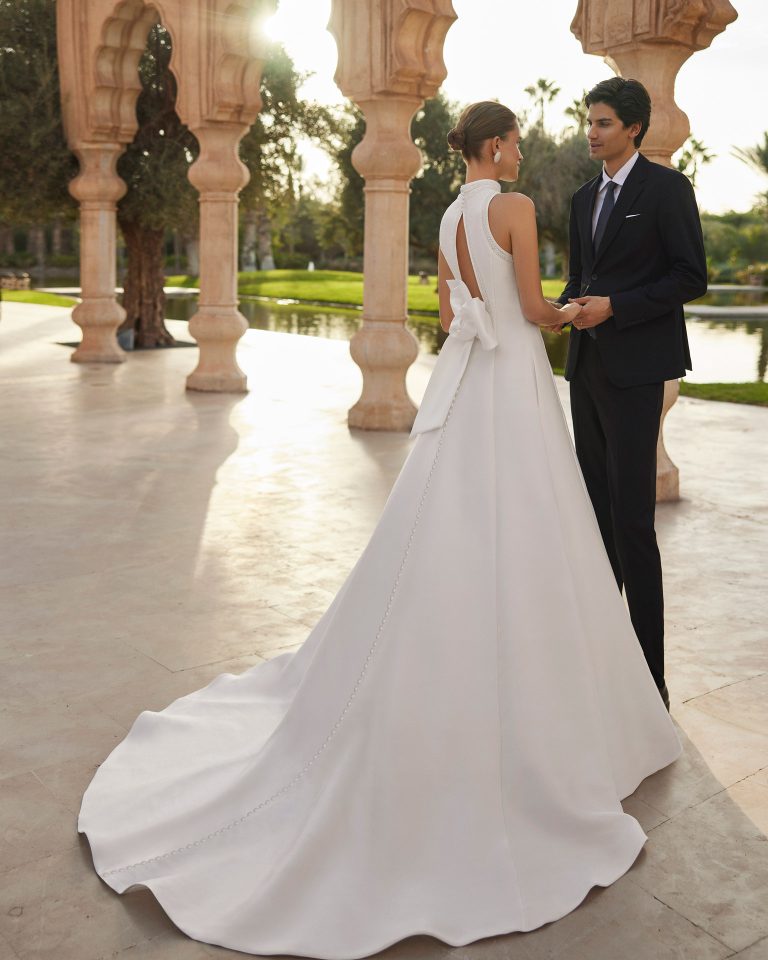 L’abito da sposa Opera di Rosa Clará esprime un’eleganza moderna e minimalista con il suo taglio pulito e lo scollo alto impreziosito da dettagli ricamati.