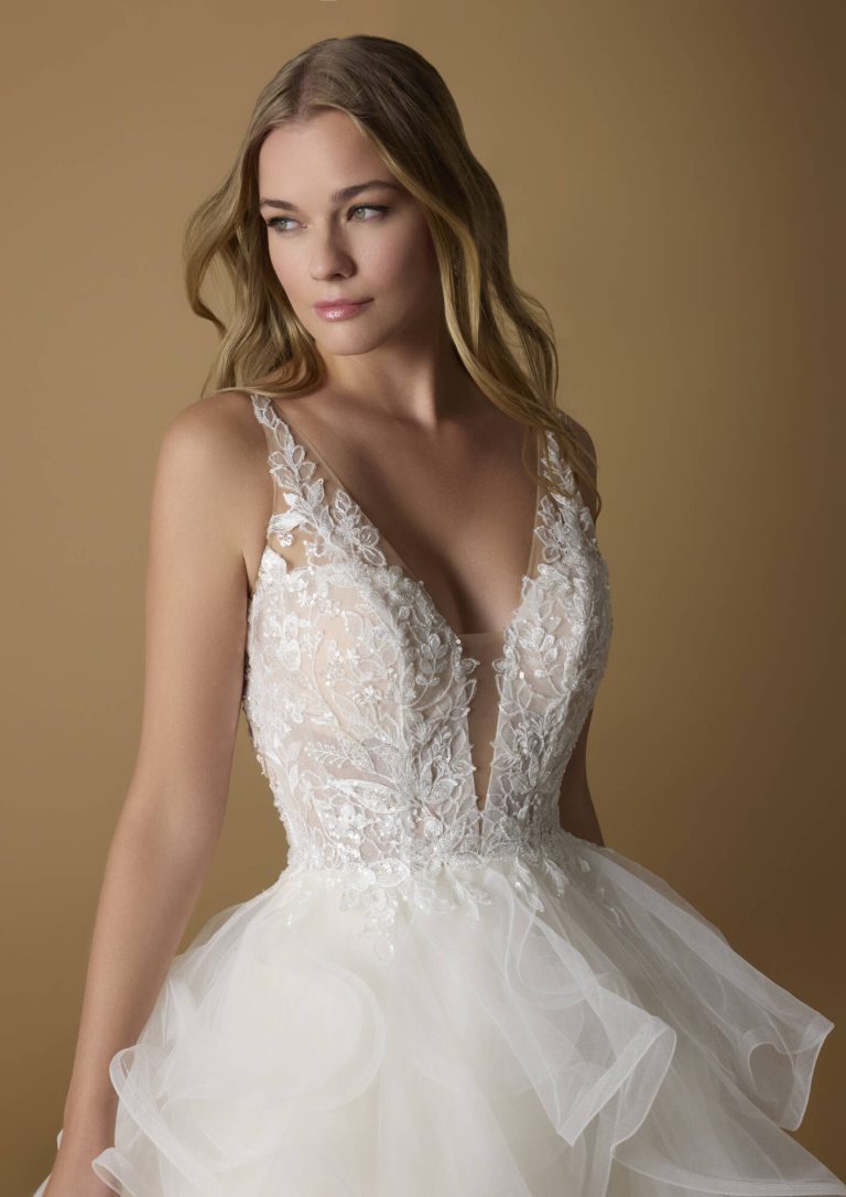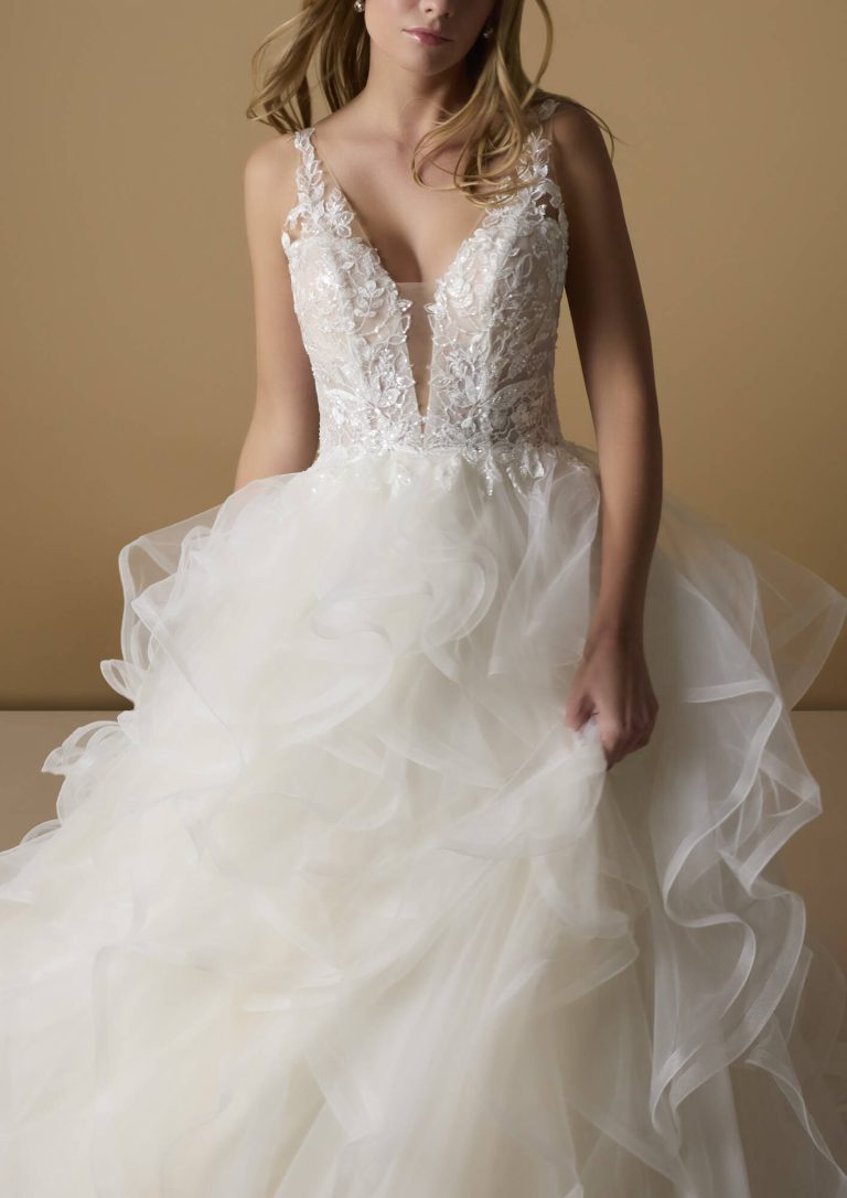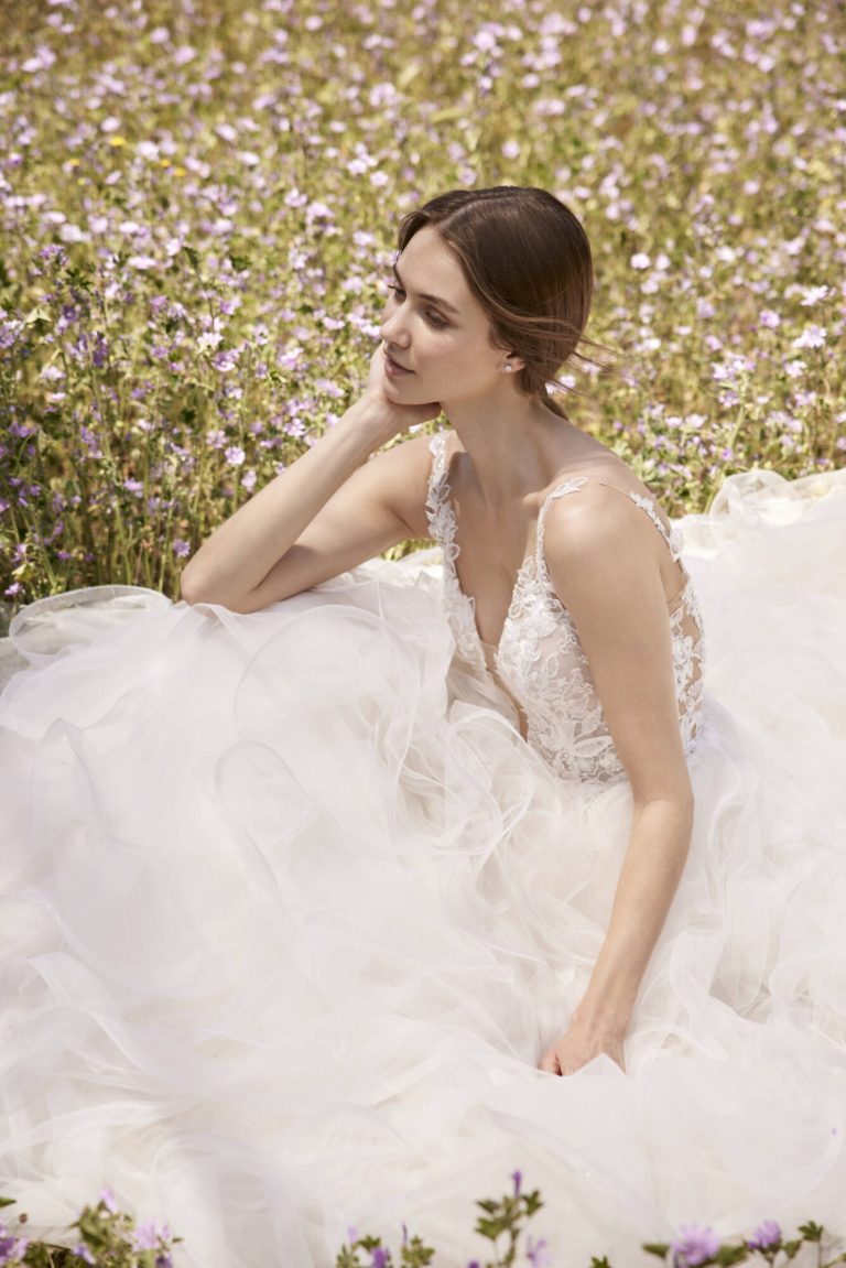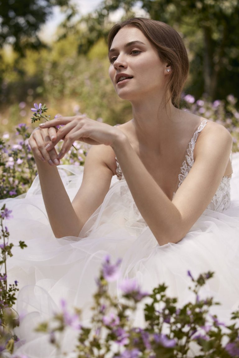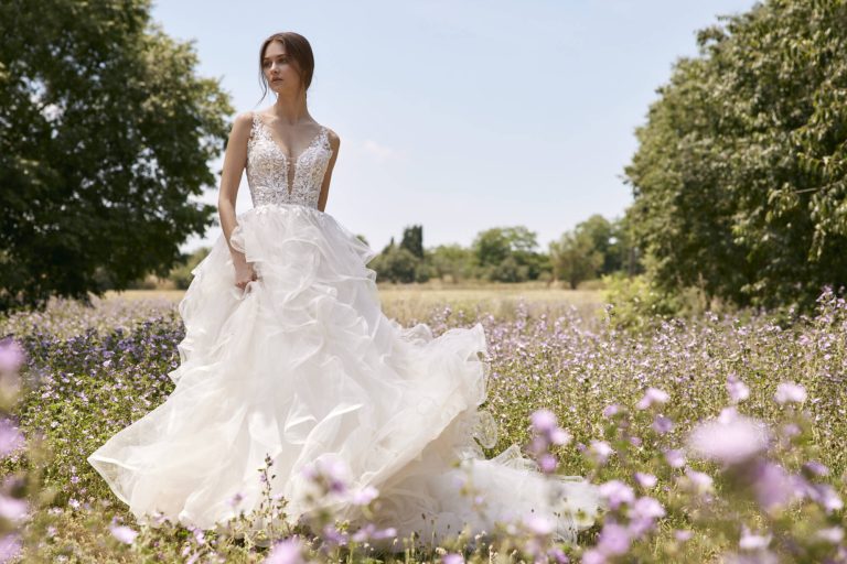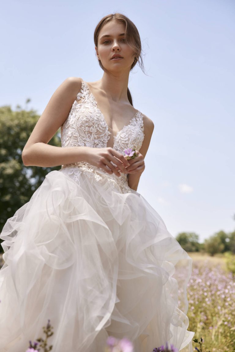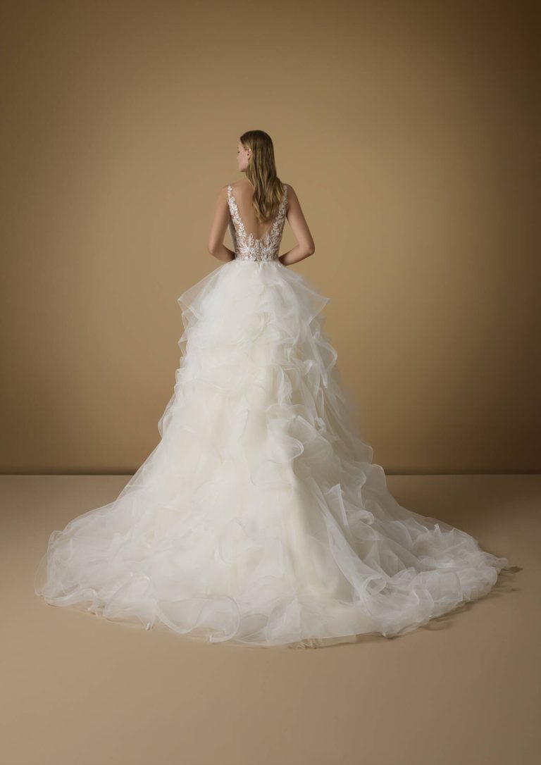 Innamorati di questo abito da sposa in tulle dal taglio principesco. Il corpetto è caratterizzato da trasparenze e fiori ricamati e da una pronunciata scollatura a V che viene riprodotta sulla schiena. La gonna del modello Patra è la grande protagonista, con la sua cascata di volant che termina con uno strascico a cattedrale.