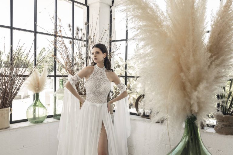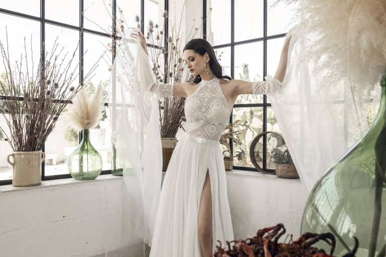 Scopri la leggerezza e l’eleganza di questo abito da sposa boho chic, con corpetto all’americana in prezioso pizzo geometrico e dettagli crochet che avvolgono le braccia con delicate maniche rimovibili. La gonna morbida in georgette leggero presenta un elegante spacco frontale che dona sensualità e movimento. Perfetto per la sposa che sogna un matrimonio romantico, naturale e raffinato.
