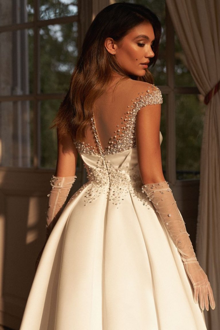 Un abito da sposa lussuoso a maniche corte. La parte superiore dell’abito è decorata con perline, paillettes, ricami con perle e cristalli. La scollatura presenta una profonda V con inserto in rete semitrasparente. Lo spacco spacco e il lungo strascico rendono il look molto suggestivo e seducente. I guanti in rete semitrasparente aggiungono raffinatezza al look