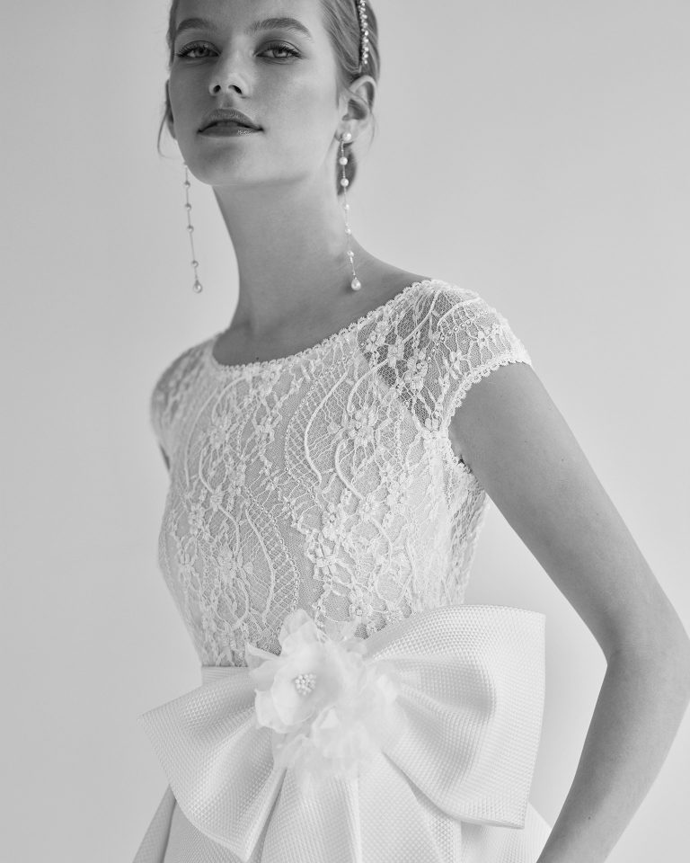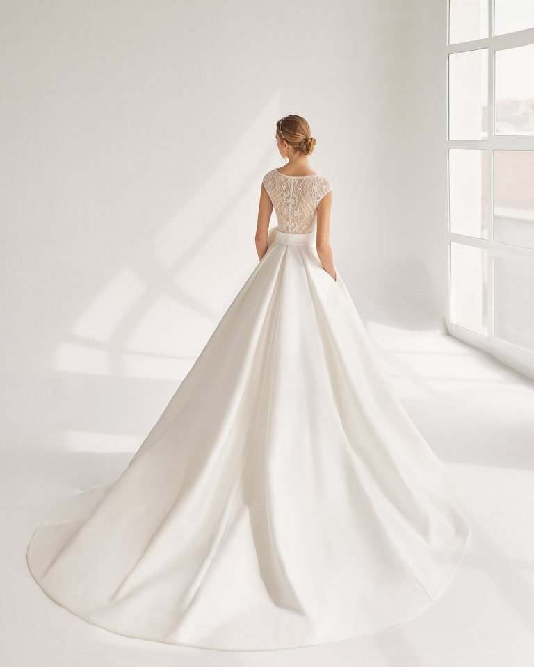 Abito da sposa in mikado con corpino gioiello ricamato e gonna ampia con fiocco. Un’eleganza raffinata e moderna, perfetta per la sposa che ama lo stile regale con dettagli contemporanei.