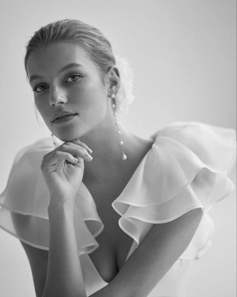 Abito da sposa in crêpe con maniche in organza effetto petalo. Essenziale, elegante e leggerissimo: un inno alla bellezza pura e al romanticismo moderno.