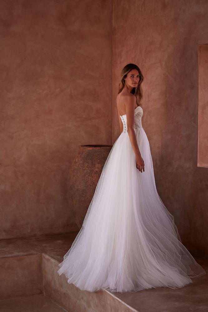River è un abito da sposa interamente realizzato in tulle avorio, caratterizzato da un corpetto decorato semitrasparente con scollo a cuore e gonna a trapezio che si allarga su infiniti strati di tulle a cascata.