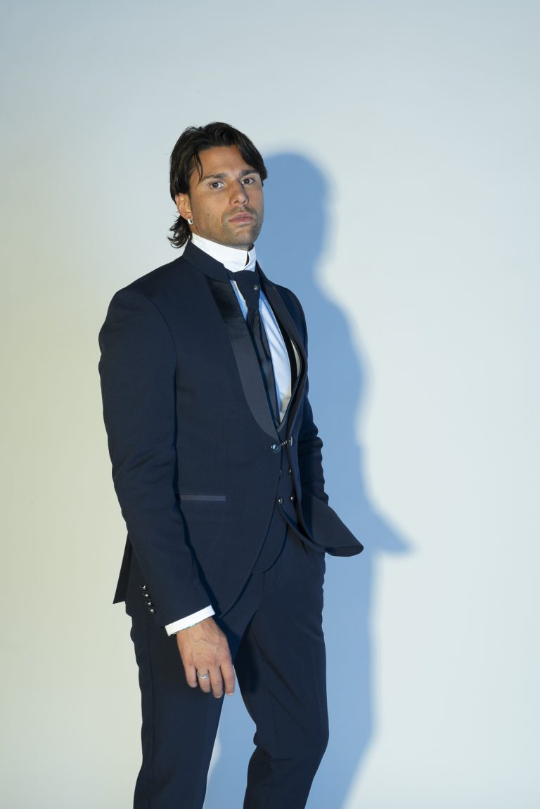 Romolo è un abito da sposo alla coreana, liscio con profili in raso, realizzato in alta sartoria.