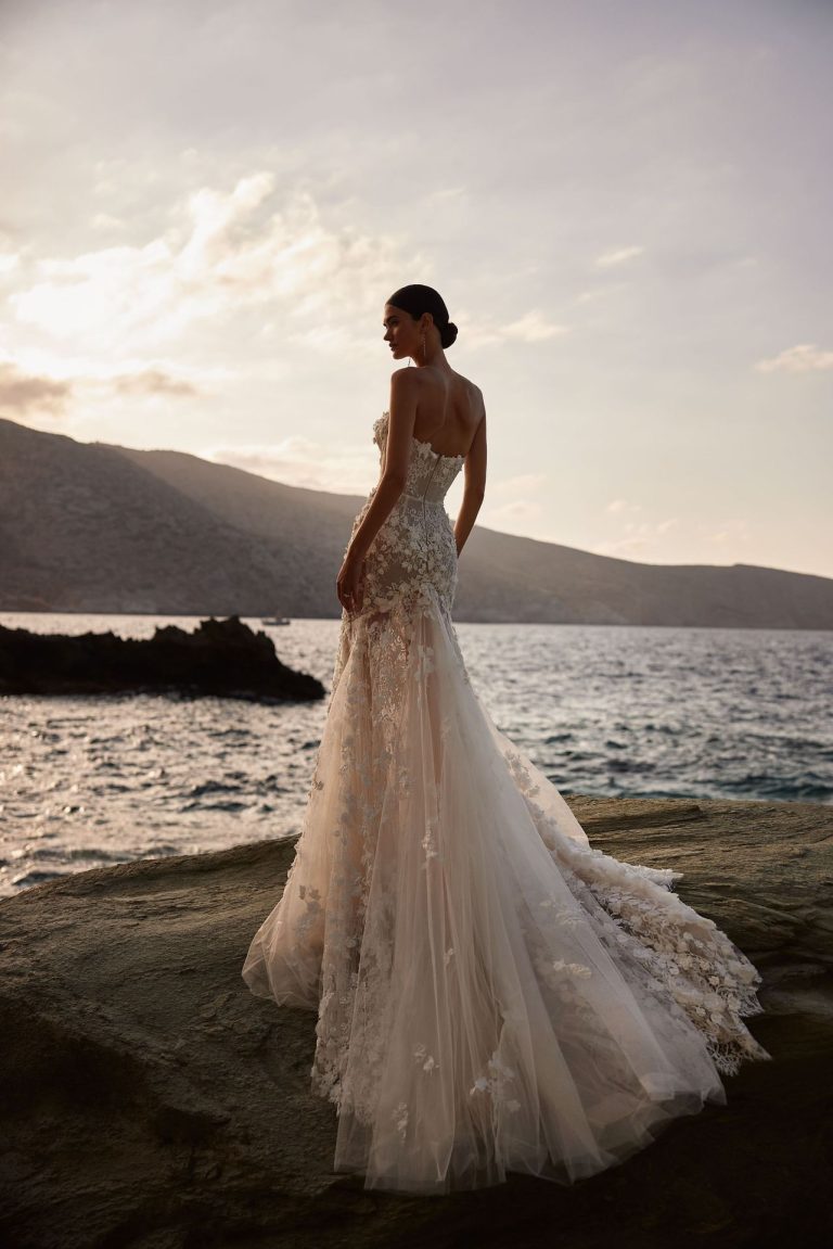 Splendido abito da sposa a sirena realizzato in pizzo semitrasparente, delicatamente decorato con applicazioni di fiori e perline. Il modello Rosetta è caratterizzato da una scollatura a cuore con profondo taglio a V effetto nudo, vanta coppe integrate in un corpetto strutturato con stecche, maniche a spalle scoperte staccabili. La gonna aderente semitrasparente, con sottogonna staccabile color carne, si prolunga con grazia in un soffice orlo in tulle color nude con un delicato strascico.