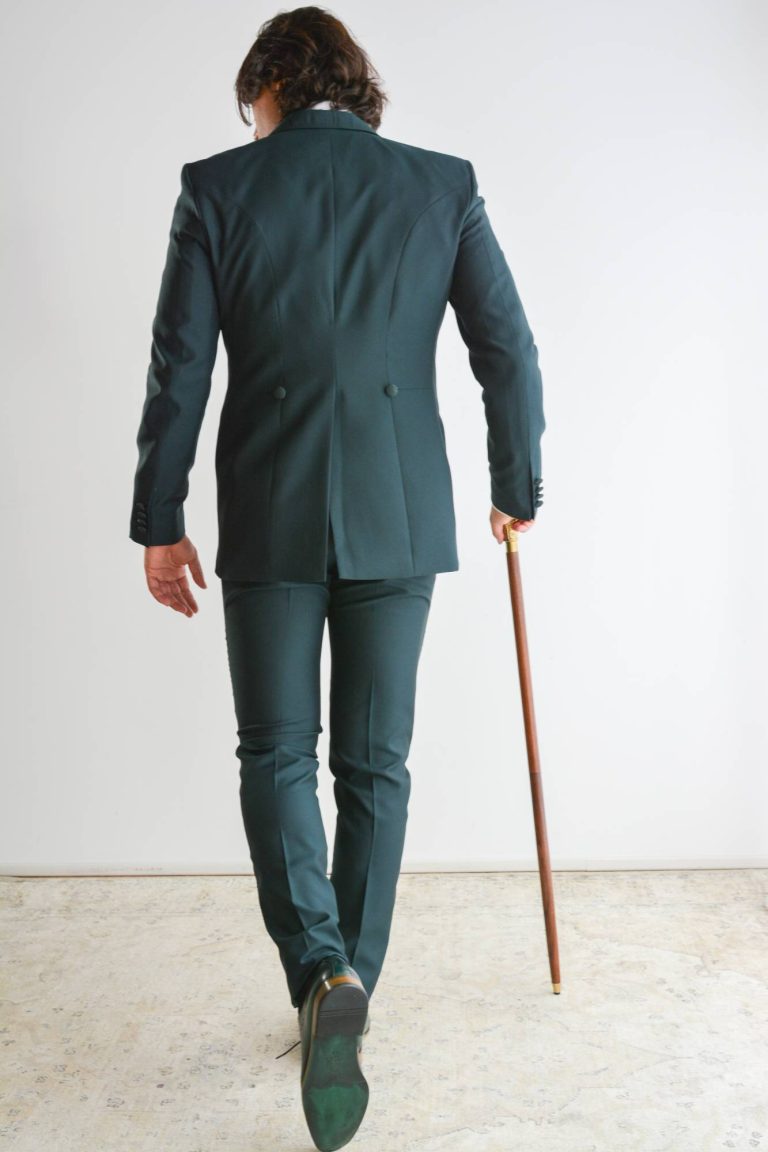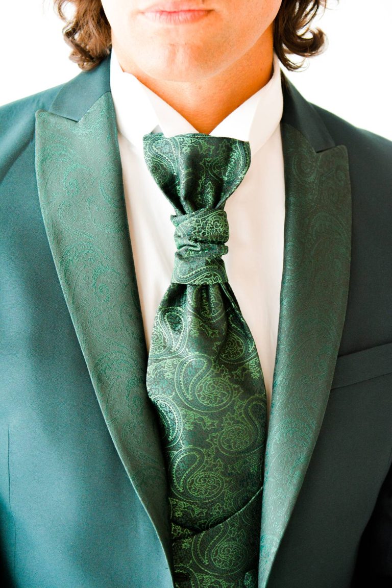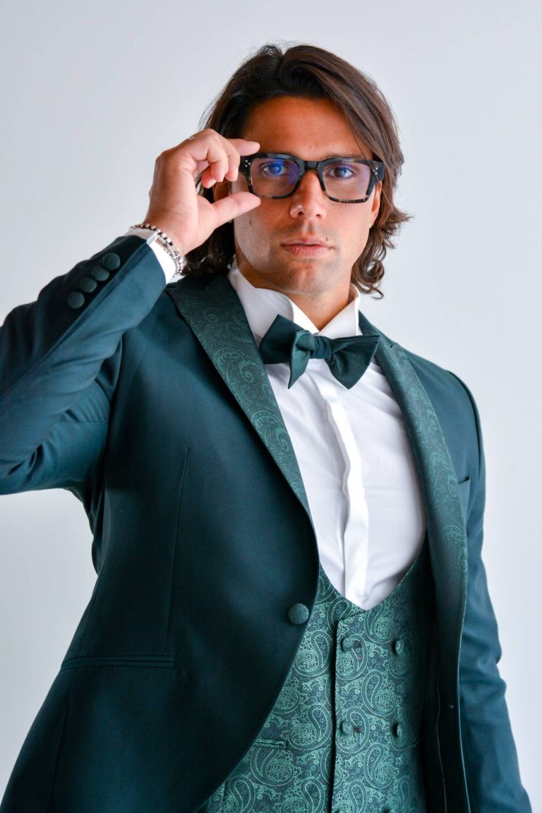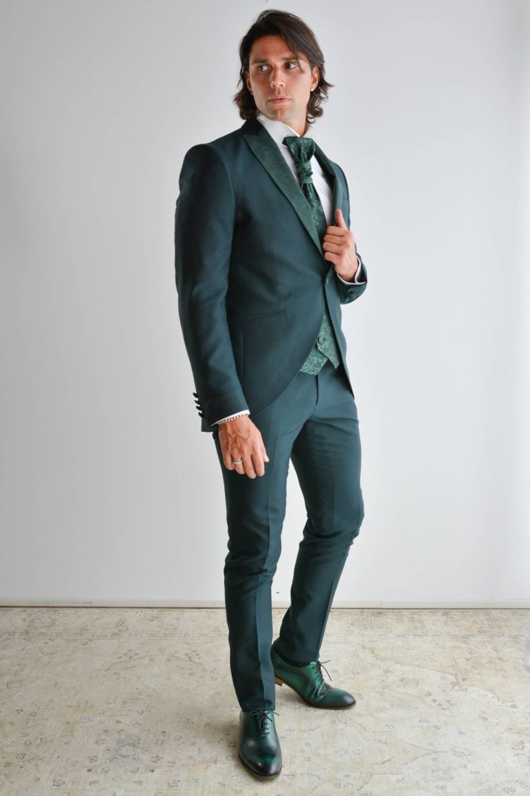 Abito da sposo mezzo tight con revers e accessorio fantasia cachemire.