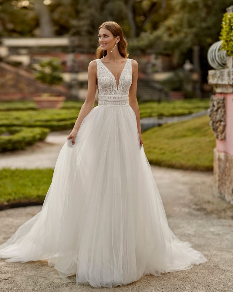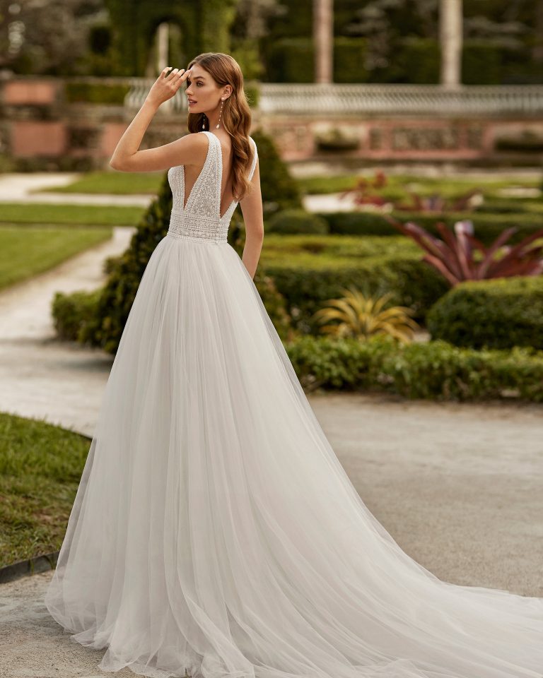 Romantico abito da sposa realizzato in tulle, pizzo e strass. Scegli di indossare questo abito unico di Aire Barcelona con scollo profondo e schiena a V per il tuo giorno più importante!