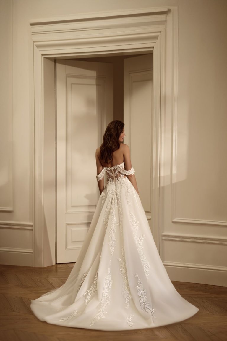 Scollatura a cuore, maniche off-shoulder e uno spacco profondo che accarezza la figura: questo abito da sposa unisce romanticismo e sensualità con ricami che sembrano fiorire sulla pelle.