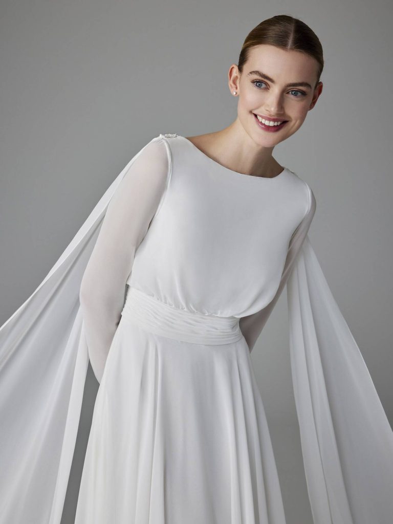 Sollemn è un abito da sposa semplice, interamente realizzato in chiffon avorio, pensato per una cerimonia sobria ed elegante.