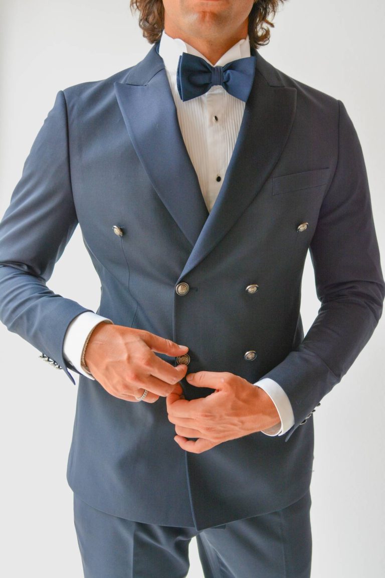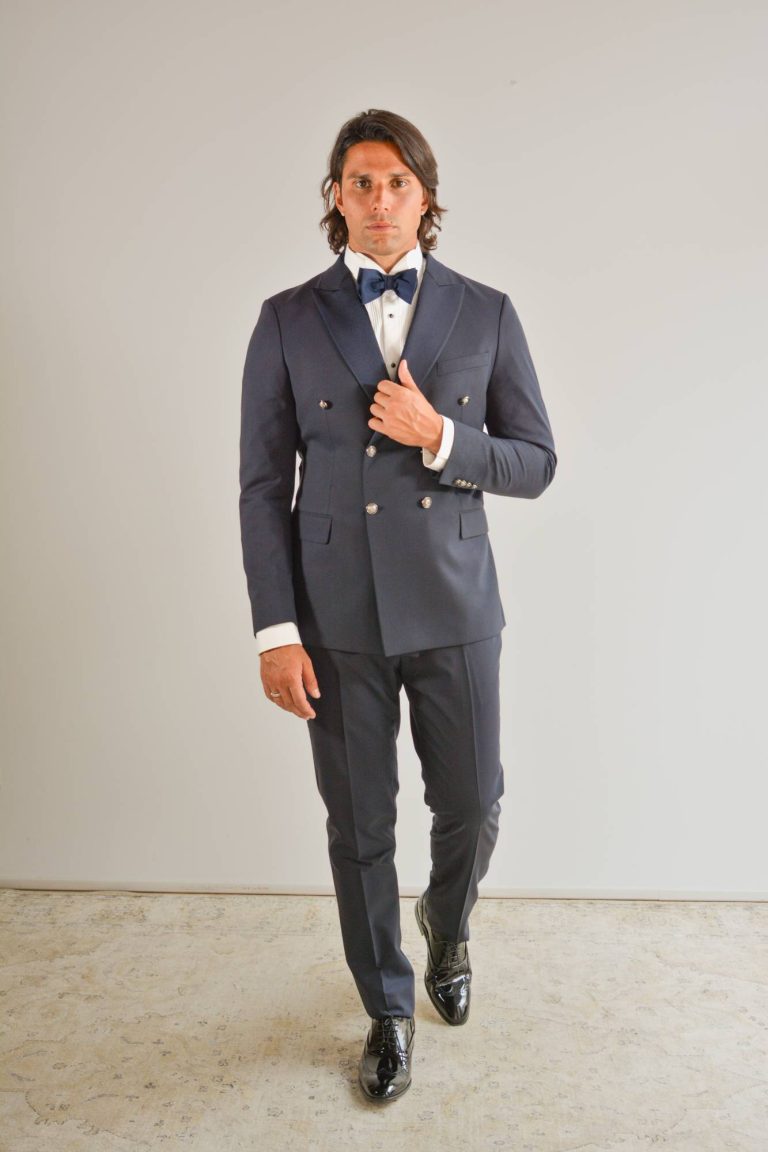 Abito da sposo elegante in blu scuro, caratterizzato da giacca doppio petto con collo a lancia e bottoni oro.