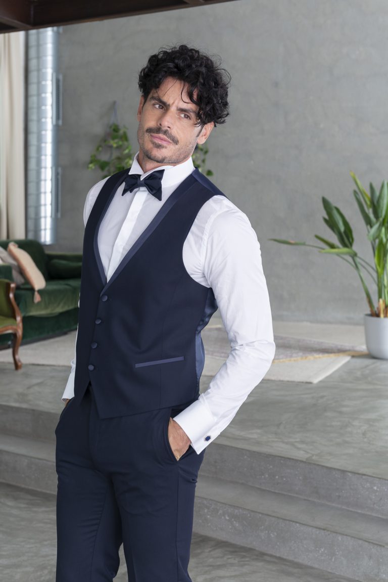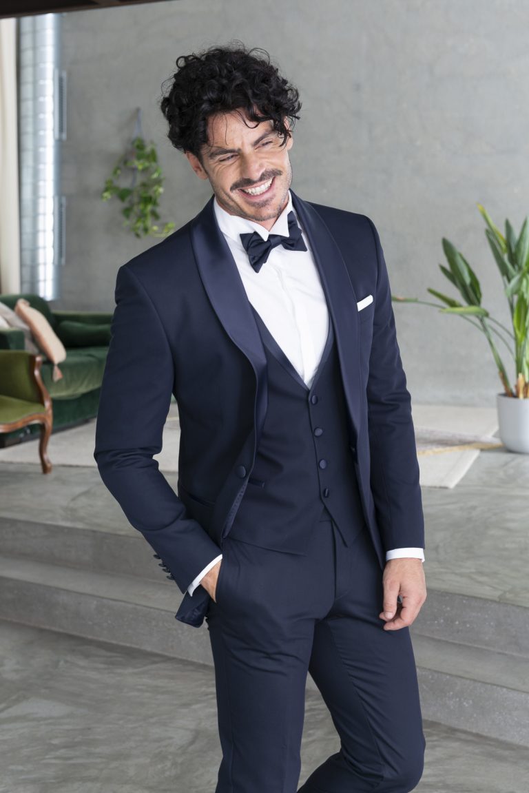 Elegante e senza tempo: Smoking blu notte con collo sciallato, must have per un matrimonio all’insegna dell’eleganza!