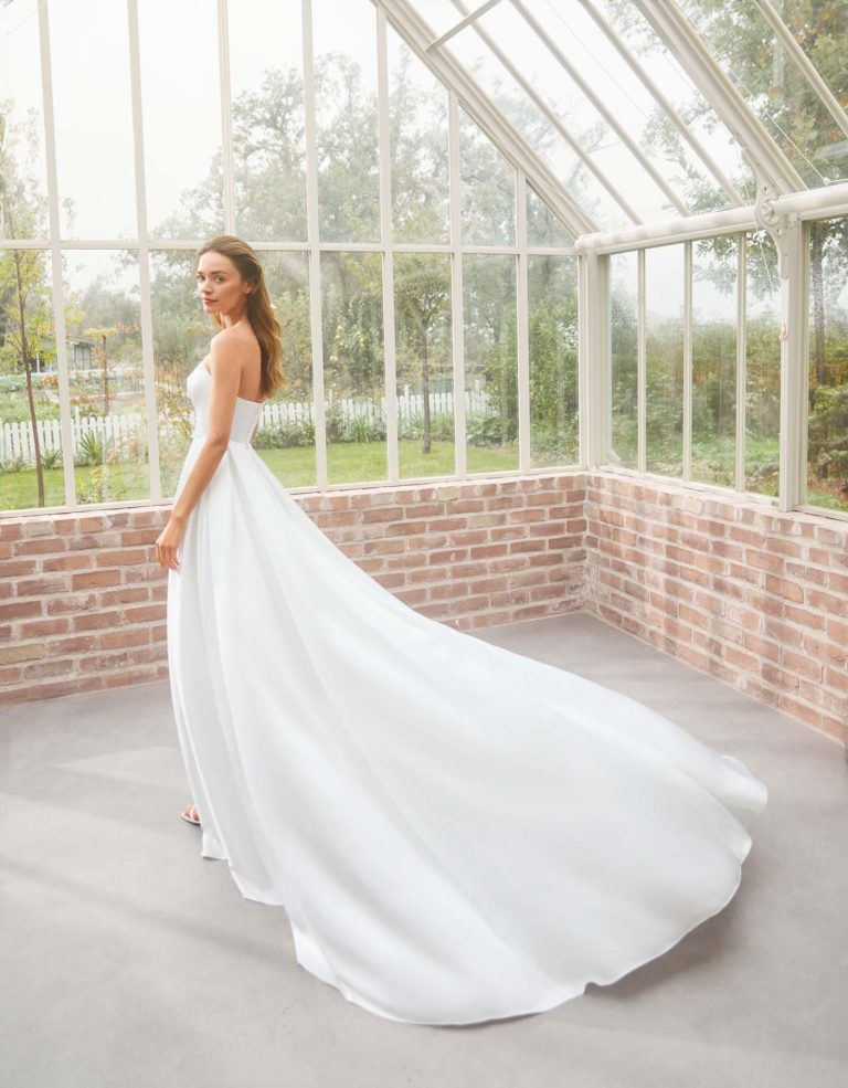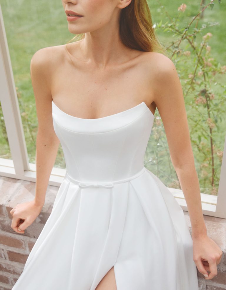 Questo abito da sposa è una creazione pura, dal fascino semplice e minimale. È realizzato in raso di seta e presenta una silhouette a trapezio valorizzata dall’apertura della gonna che lascia scoperte le gambe e dona movimento.