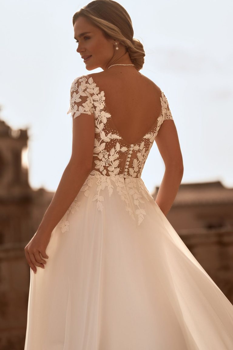 Questo modello in chiffon conquista con la sua linea classica e l’eleganza senza tempo. Il corpetto semi-trasparente in tulle ricamato floreale è valorizzato da delicati giochi di pizzo e microperline, mentre le maniche ad aletta aggiungono un tocco di grazia romantica. La gonna morbida scivola leggera fino a terra, creando un movimento etereo e impalpabile.