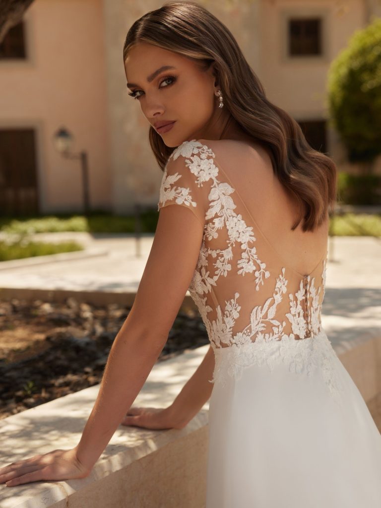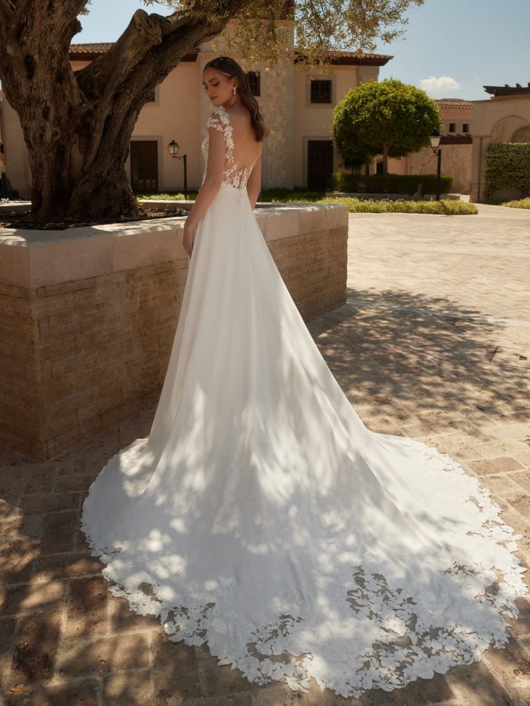 Un abito da sposa che racconta l’eleganza senza tempo: corpetto in pizzo floreale con delicato effetto tattoo, scollo a cuore velato da un tulle trasparente e maniche corte, abbinato a una gonna in crêpe morbido che scivola sinuosa fino al lungo strascico. Un sogno raffinato per la sposa che desidera leggerezza e grazia.