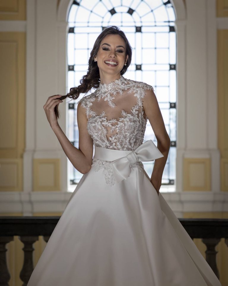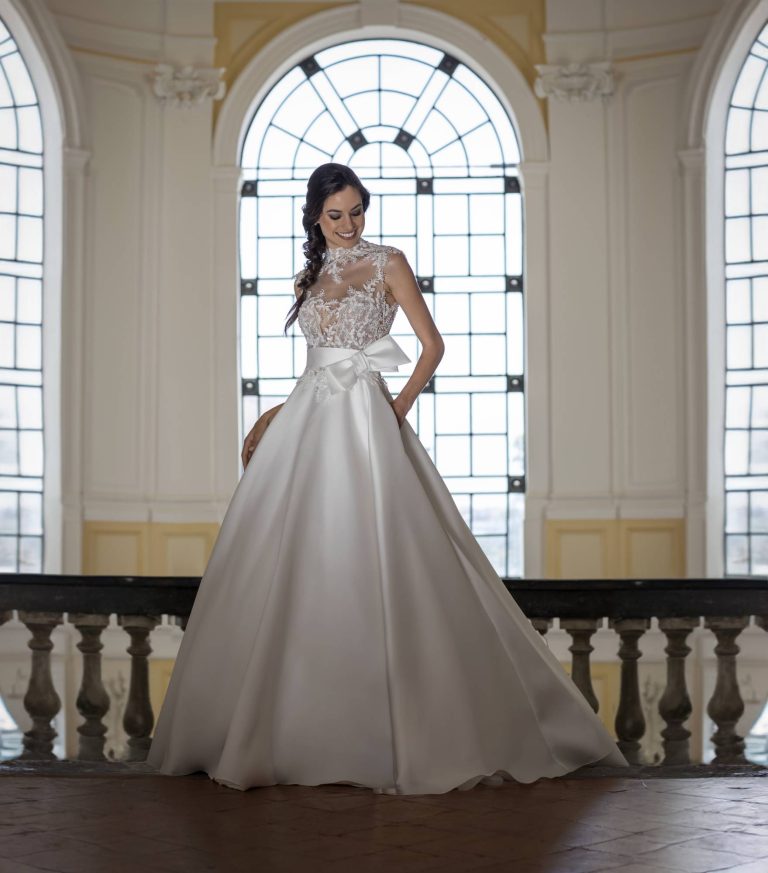 Abito da sposa caratterizzato da corpetto a collo alto in pizzo e gonna ampia in Mikado. Cintura con fiocco staccabile in Mikado.