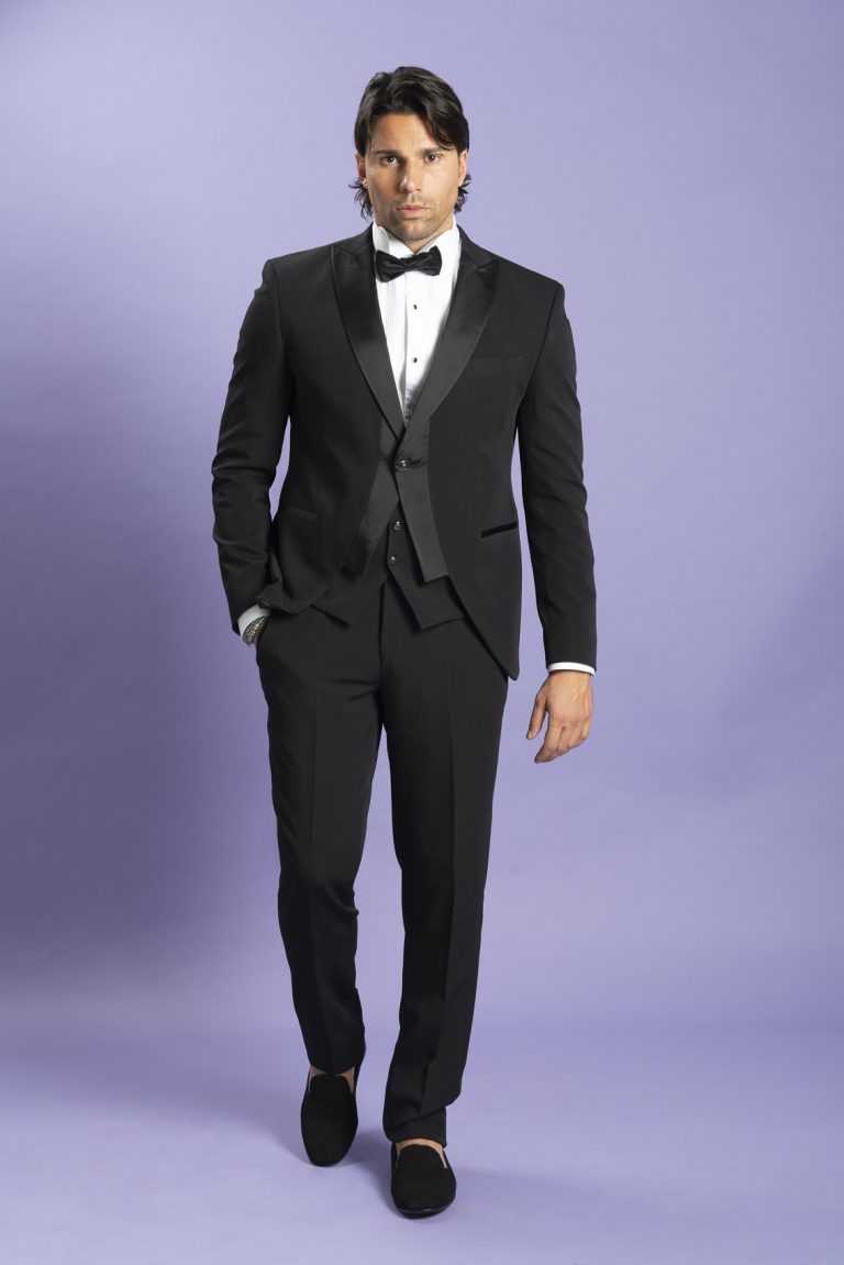 Valeriano II è un abito da sposo Demi Frac, giacca con collo punta lancia in raso, il completo è realizzato in tessuto color nero elasticizzato.