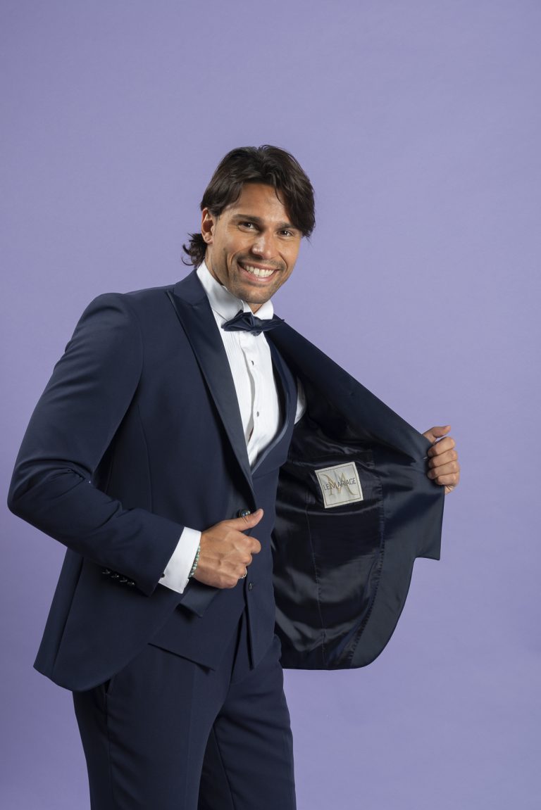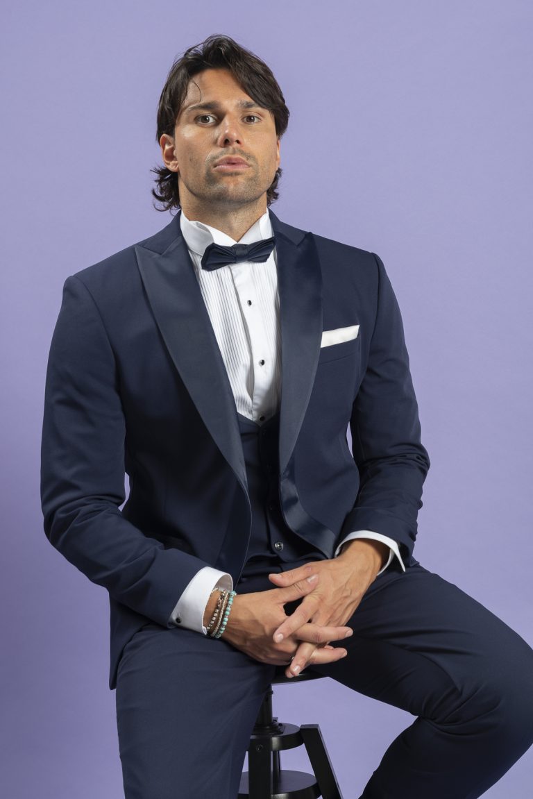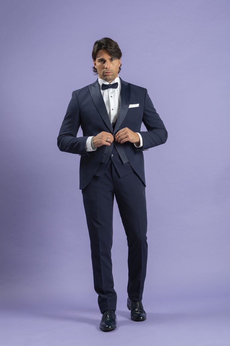 Valeriano è un abito da sposo Demi Frac, giacca con collo punta lancia in raso blu notte, il completo è realizzato in tessuto elasticizzato.