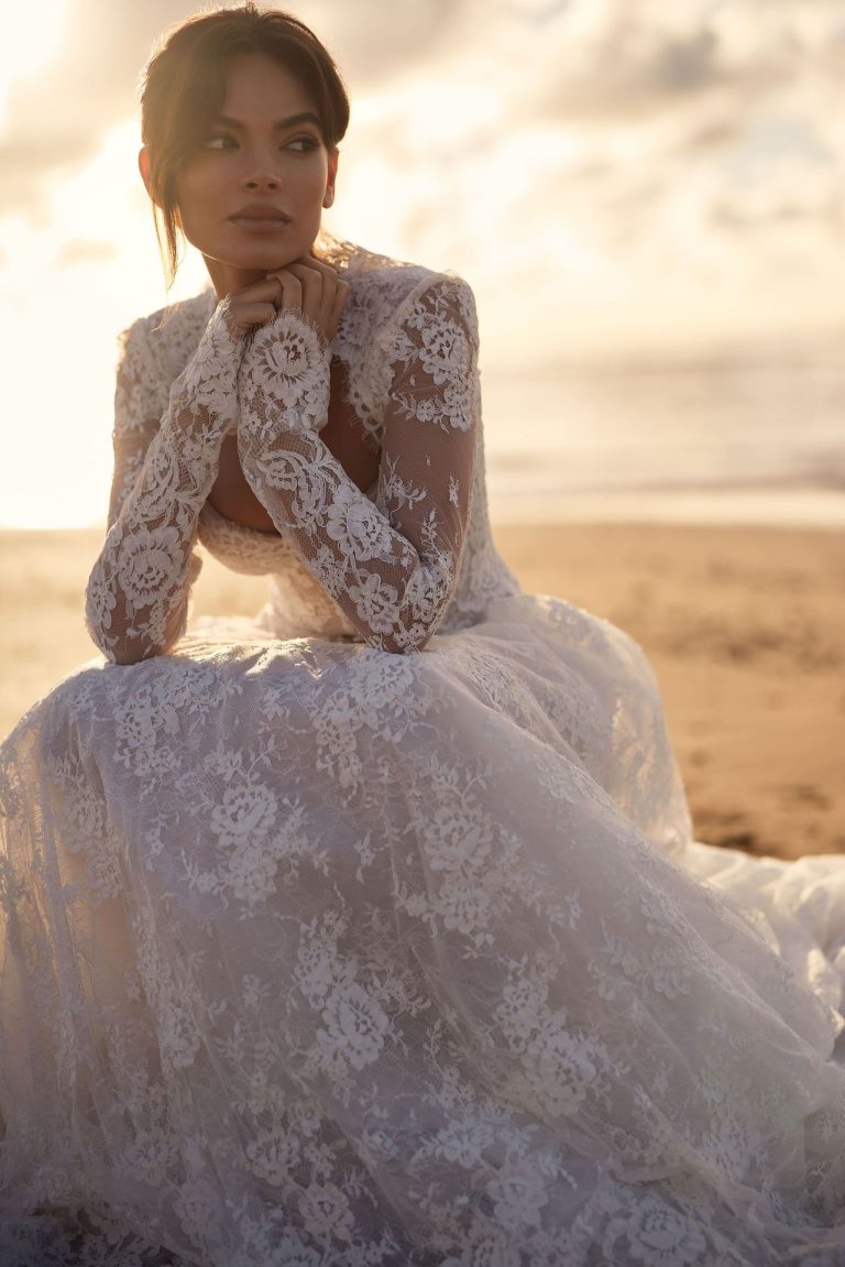 Romantico abito da sposa a trapezio con spalline sottili, realizzato in delicato pizzo chantilly. Caratterizzato da un corpetto aderente semitrasparente a vita bassa con stecche delicate a vista e bottoni decorativi, coppe integrate e una gonna fluida a trapezio con orlo smerlato e lungo strascico. L’abito può essere completato con un bolero Vanessa a maniche lunghe realizzato in pizzo floreale trasparente.