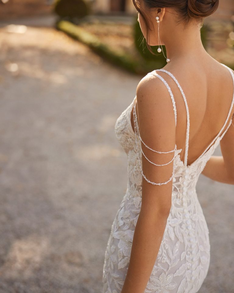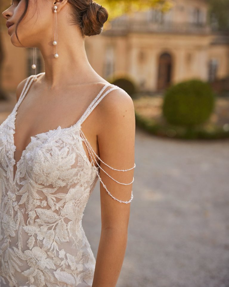 Abito da sposa a sirena realizzato in pizzo ricamato e caratterizzato da un ampio strascico regale.